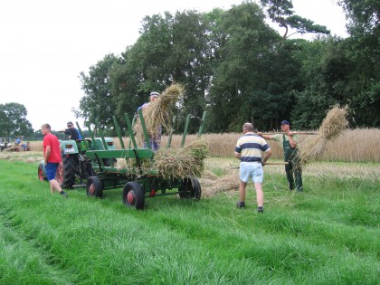 Später wird das Getreide zur Mühle Hahnentange transportiert. Dort findet dann im Oktober ein historisches Dreschfest statt, an dem die Schlepperfreunde aktiv teilnehmen.