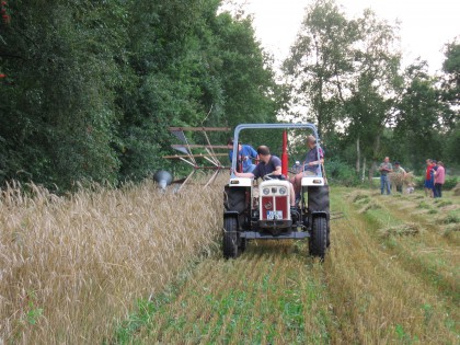 Mit unseren historischen Mähmaschinen wird das Getreide von Mitgliedern der Schlepperfreunde abgemäht und in Garben zum Trocknen aufgestellt.