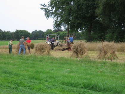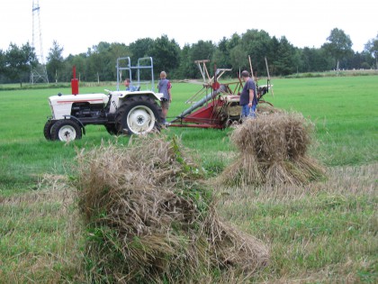 Mit unseren historischen Mähmaschinen wird das Getreide von Mitgliedern der Schlepperfreunde abgemäht und in Garben zum Trocknen aufgestellt.
